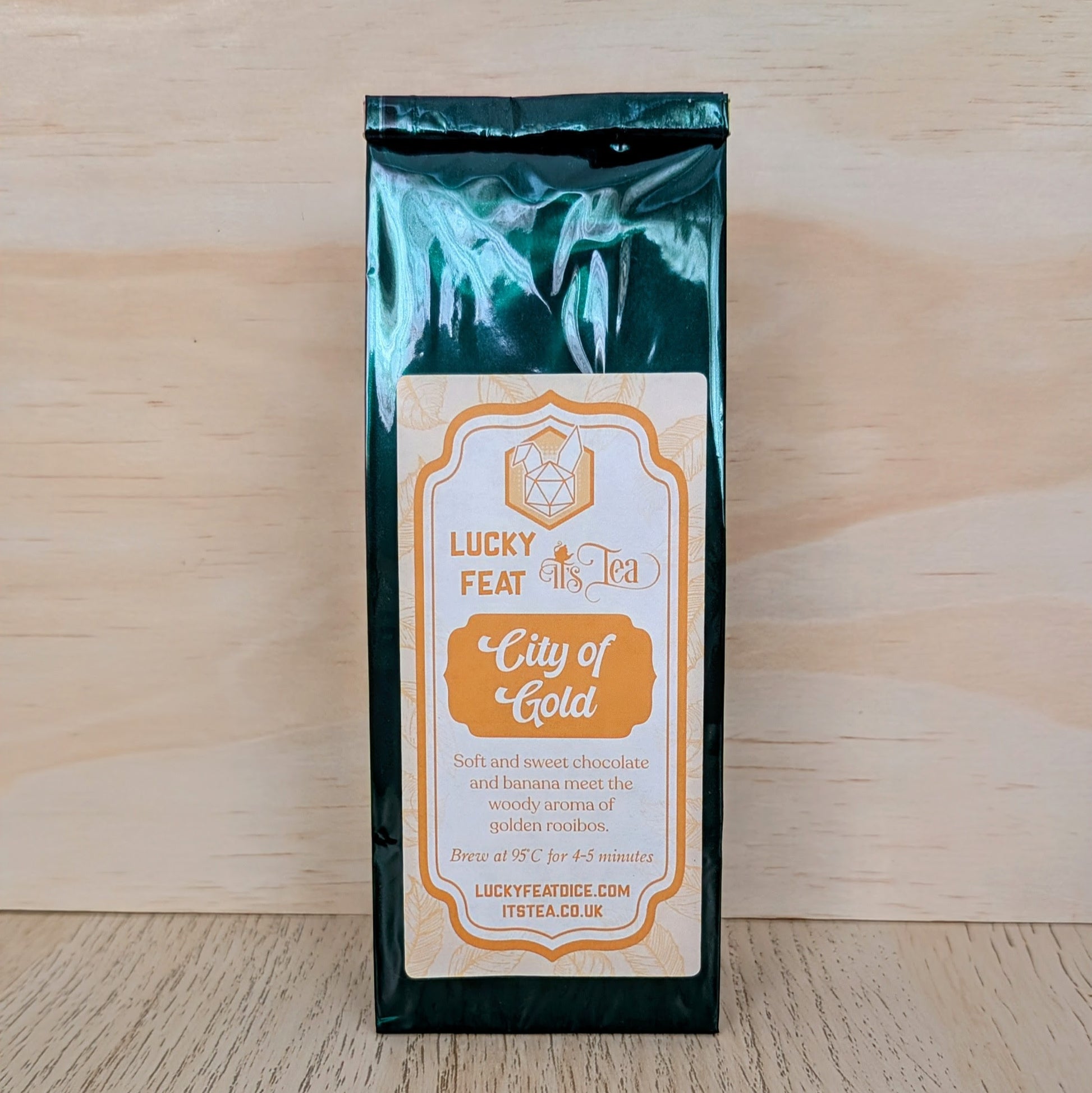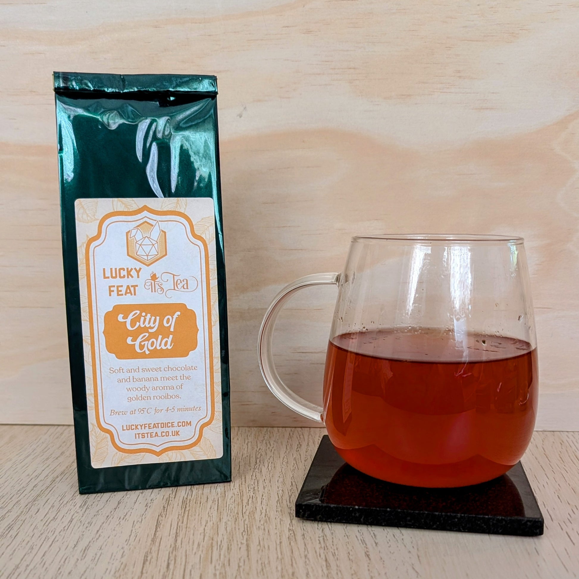 Lucky Feat & It's Tea present City Of Gold: soft and sweet chocolate and banana meet the woody aroma of golden rooibos
